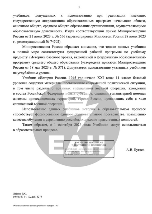 Как сообщается в письме первого замминистра просвещения, учебник «История России. 1945 год - начало XXI века: 11 класс: базовый уровень» содержит материалы, посвященные современной политической ситуации, в том числе разделы о причинах специальной военной операции, вхождении в состав Российской Федерации новых субъектов, оказании гуманитарной помощи жителям присоединенных территорий, героях России, проявивших себя в ходе специальной военной операции. «Использование единых учебников истории в образовательном процессе способствует формированию единого образовательного пространства, повышению качества обучения и укреплению российских духовно-нравственных ценностей», — заключает первый замминистра просвещения Александр Бугаев.