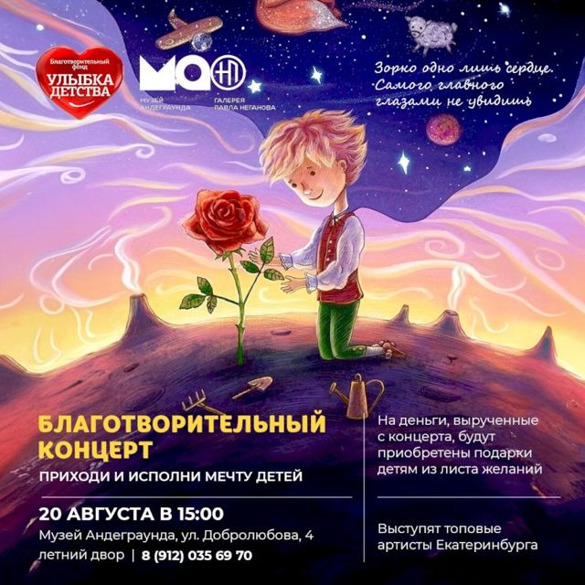 На концерте выступят топовые артисты Екатеринбурга, а актриса Кристина Русанова прочитает со сцены «Маленького принца» Экзюпери. Организатор мероприятия – благотворительный фонд «Улыбка детства».