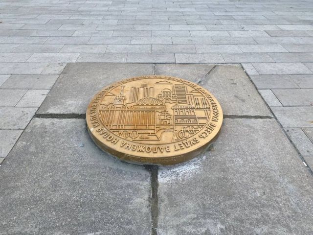 В Екатеринбурге на Плотинке установили временный люк на яме, в которой последние 50 лет пролежала капсула времени. Фото крышки с изображением достопримечательностей города опубликовал telegram-канал «Дизайн-код Екатеринбурга».