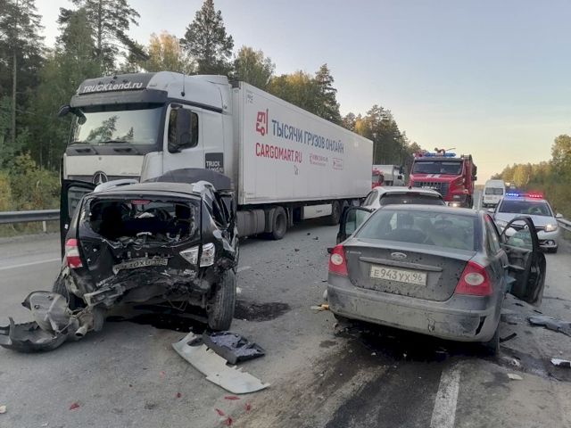 Вчера на ЕКАД в районе развилки у ТЭЦ произошло ДПТ с участием четырех автомобилей. По предварительной информации, водитель автомобиля Ford следовал со стороны ТЭЦ в направлении Березовского, не соблюдая безопасную дистанцию до впереди идущей машины. Из-за чего на 15-м км автодороги он столкнулся с автомобилем Nissan, который ударом отбросило на соседнюю машину марки Mazda. Она оказалась на встречной полосе движения и врезалась в грузовой автомобиль Mercedes.