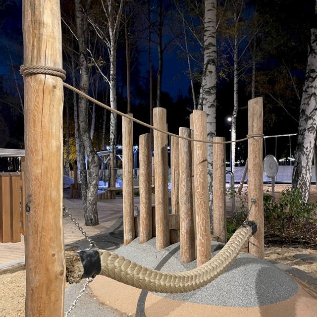Это участок, который раньше был огорожен баннером с нарисованным лесом. Новая круглогодичная и бесплатная зона отдыха (раньше она была платной) включает в себя площадку с активными и спокойными играми, место для игр с песком и водой, полосу препятствий, зоны отдыха, детский театр, квест-игру. Благоустраивали территорию в течение года.