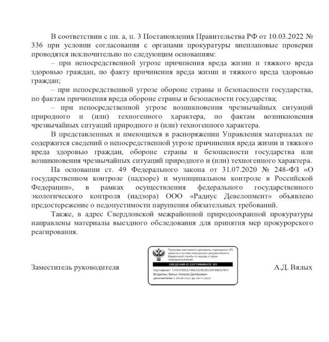 Согласно документу, по итогам проверки застройщику ООО «Радиус Девелопмент» объявлено предостережение о недопустимости нарушения обязательных требований. В адрес Свердловской межрайонной природоохранной прокуратуры направлены материалы выездного обследования для принятия мер прокурорского реагирования.