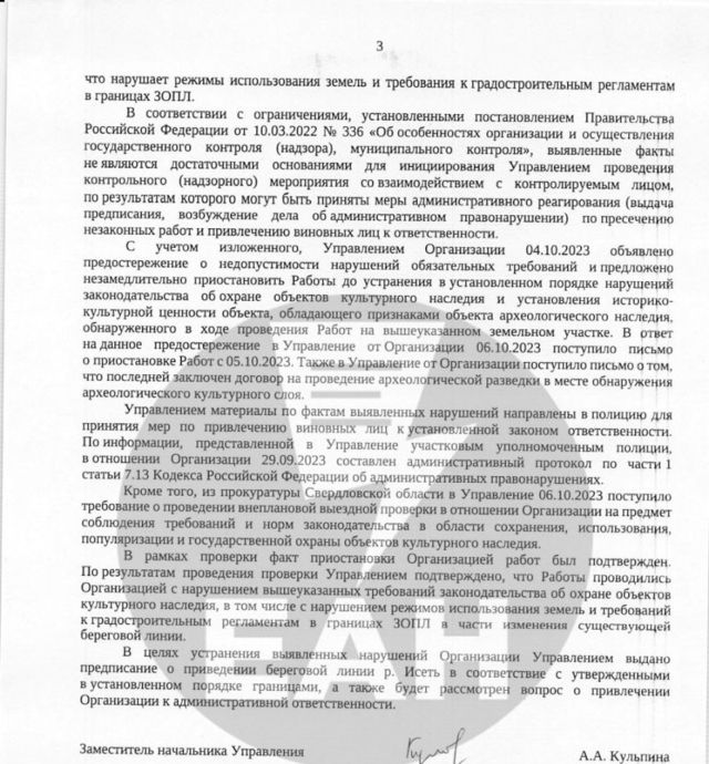 В управлении отметили, что была проведена проверка деятельности застройщика на основании обращений граждан. По ее результатам было установлено, что при проведении работ ширина реки уменьшилась. Кроме того, ревизоры обнаружили на правом берегу реки (где ведутся работы) «объект, обладающий признаками объекта археологического наследия». Также в районе проведения работ, как отметили в управлении, есть подтвержденный культурный слой.