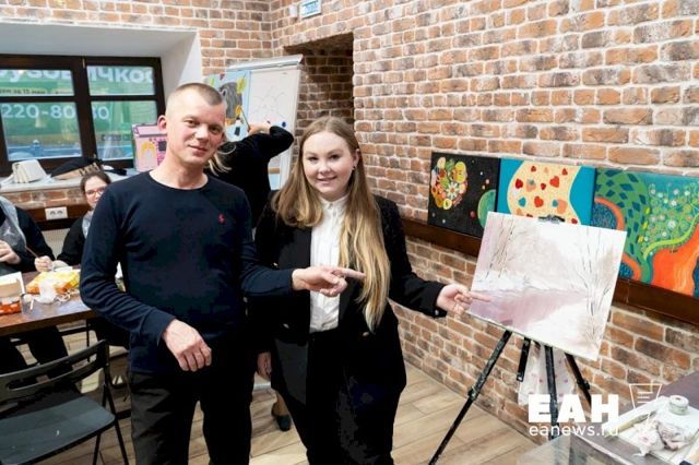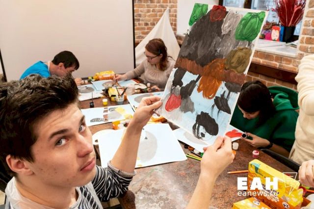 ЕАН тоже решил поучаствовать в мастер-классе, и пока Мила Миронова обучала детей, Евгений помог нарисовать корреспонденту пейзаж масляными красками с помощью мастихина – специального художественного инструмента, похожего на шпатель. Так на занятии все были заняты одним общим делом – творили искусство удовольствия ради.