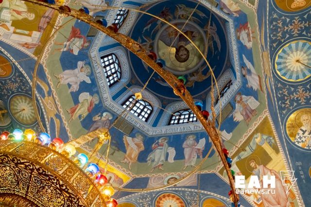 Достаточно много в этой росписи отсылок к истории России. Арочную часть венчают образы святых царственных страстотерпцев. Сразу после престольного праздника Илья Фирулев займется росписью притвора. При украшении храма использовалось настоящее сусальное золото, но, как отметил мастер, в разумных пределах.