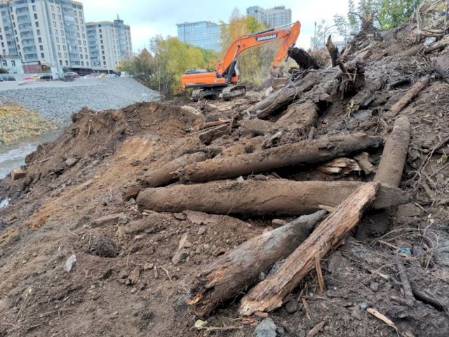 Летом на берегу Исети начались работы по берегоукреплению, в рамках которых застройщик убрал деревья по обе стороны реки и произвел отсыпку щебнем.
