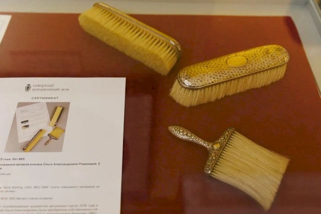 Первыми вещи княгини смогли увидеть гости встречи ее памяти. Это мероприятие было организовано спонтанно, с его проведением помог коллекционер, предложивший выставить в экспозиции личные вещи великой княгини: ранее он приобрел их на аукционе и перевез в Россию из Канады, рассказал Александр Емельянов. Одним из этих экспонатов является туалетный набор Ольги Александровны из платяных щеток.
