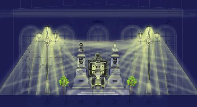 Помимо обычных светильников дополнительно установят прожекторы, свет которых должен быть направлен на бюсты императора и императрицы. Отдельно в схеме прописаны и углы освещения. Для установки конструкций подрядчик должен будет прорыть еще и траншею. Само оборудование должно поступить до конца текущего года.
