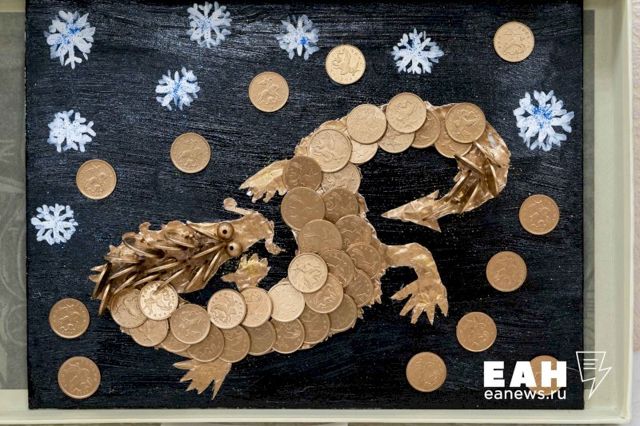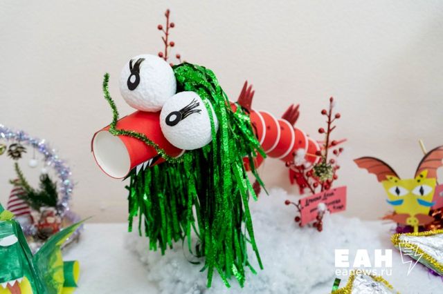 Участники представили работы из самых разных материалов – от ткани до монет и пластилина. Один из драконов был изображен 3Д-ручкой, другой нарисован отпечатками детских рук, еще один появился на свет из деревянной коряги.