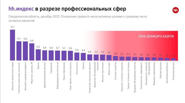 HR-индекс Свердловской области сейчас составляет 2,7. Это говорит о серьезном дефиците кадров. Норма для рынка 5,6 человек на вакансию, отмечает директор hh.ru Урал Оксана Сидлецкая. Безработица сохраняется на историческом минимуме и составляет 0,6%. Но, по словам экспертов, свердловчане не торопятся искать работу и с осторожностью относятся к смене работы.