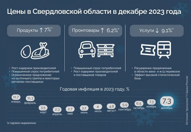 Инфляция в годовом выражении в Свердловской области по итогам декабря 2023 года составила 7,3%, следует из материалов Уральского главного управления Банка России. Это выше, чем в Уральском федеральном округе (6,4%), но оказалось чуть ниже общероссийского показателя (7,3%).