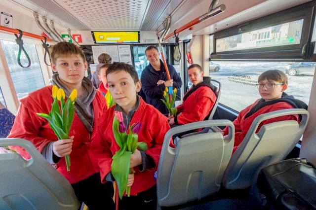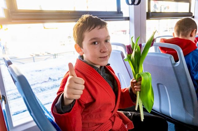 Одной из первых свой букет получила водитель «Львенка». Праздничный экспромт не оставил равнодушным ни одного пассажира трамвая. Юные самбисты в награду получили улыбки, теплые слова благодарности и отличное настроение.