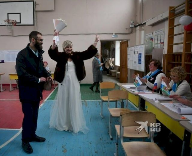 Едва невеста в белом свадебном платье и с букетом переступила порог избирательного участка, раздались аплодисменты и громкое «Поздравляем!». Сама процедура голосования заняла несколько секунд.