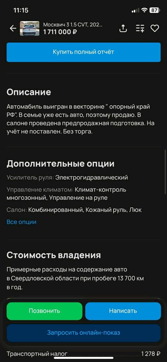 Жительница свердловского поселка Белоярский выставила на продажу «Москвич», выигранный в викторине «Опорный край». Женщина хочет выручить за него 1 млн 711 тыс. рублей. Она поясняет, что продает авто потому, что у ее семьи уже есть автомобиль.