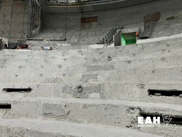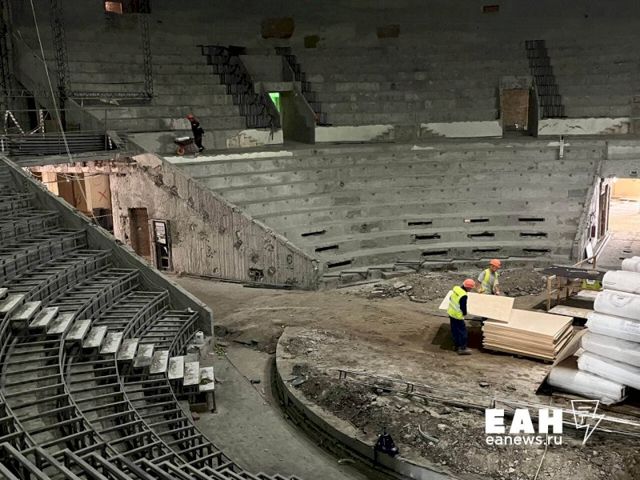 Внутри здание не узнать из-за разрухи: все в пыли, нет ни стен, ни пола, ни потолка, но главная сцена выглядит по-прежнему помпезно. В главном зале рабочие уже сменили половину сидений: вместо единого бетонного монолита теперь они будут сварены из металлических конструкций. По словам прораба строительной компании, это немного уменьшит вместимость зала, но значительно улучшит комфорт зрителей, ведь проходить в зал после ремонта будет гораздо удобнее, так как между сидячими местами станет больше места. Кроме этого, рабочие уже начали укреплять все несущие конструкции внутри и разбирать крышу. Отметим, несмотря на то, что работа идет полным ходом, об ее окончании речи пока не идет.