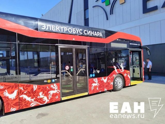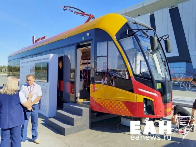 Сразу на входе перед выставочным центром гостей встречают настоящее и будущее общественного транспорта. На постаменте расположен макет скоростного поезда для высокоскоростных магистралей, которые планируется протянуть из столицы, в том числе до Екатеринбурга. Сам макет, предположительно, из гипсокартона. Рядом с этим амбициозный проектом соседствует трамвай «Львенок», который курсирует по первой в стране межмуниципальной линии из Екатеринбурга в Верхнюю Пышму.