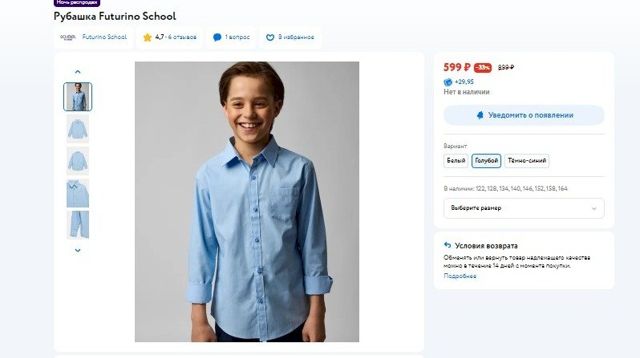 В стоимость формы для мальчиков мы заложили две пары самых бюджетных брюк (по 899 рублей), две рубашки (по 599 рублей), кардиган (799 рублей), галстук-бабочку (249 рублей), ранец (799 рублей), туфли (1399 рублей), ремень (381 рубль). В результате мальчика можно одеть к школе за 6623 рубля.
