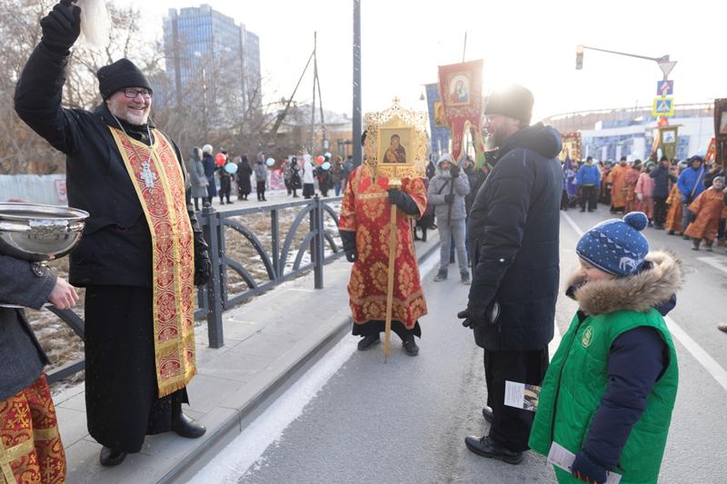 Праздничное богослужение во главе с митрополитом Екатеринбургским и Верхотурским Евгением (Кульбергом) прошло в Свято-Троицком кафедральном соборе. О важности события говорит хотя бы то, что на службу приехали шесть архиереев, в том числе митрополит Ташкентский и Узбекистанский Викентий (Морарь), митрополит Челябинский и Миасский Алексий (Орлов), а также епископы Екатеринбургской и Челябинской митрополий. К концу богослужения верующие начали выстраиваться у выхода из собора в ожидании начала крестного хода. Маршрут шествия остался неизменным – от Свято-Троицкого собора до часовни Св. Екатерины.
