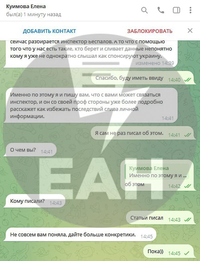 Корреспонденту ЕАН, несколько лет назад работавшему в Ura.ru, в telegram обратился некто, представившись Куимовой Еленой Викторовной, директором «Сибирско-Уральской медиакомпании». Из сути вопросов стало понятно, что это провокация, причем явно имеющая украинский след.