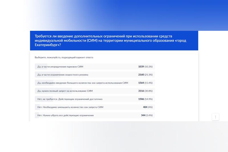 Большинство екатеринбуржцев выступают за полный запрет средств индивидуальной мобильности. Об этом свидетельствуют результаты опроса, который сегодня проводится последний день на «Госуслугах».