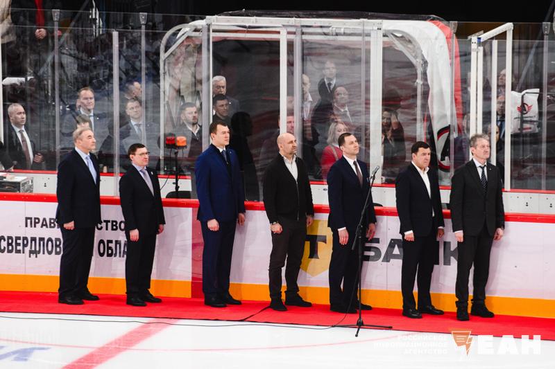 Перед игрой состоялось яркое шоу, идея которого – все начинается с мечты, затем выступили почетные гости. Министр спорта России Михаил Дегтярев сообщил, что арена откроет новые возможности для развития хоккея, фигурного катания, баскетбола и других видов спорта, заместитель председателя Совета Федерации Владимир Якушев выразил уверенность, что «долгие и долгие годы эта арена будет служить людям и радовать всех», уральский полпред Артем Жога поздравил всех с открытием, губернатор Свердловской области Евгений Куйвашев поблагодарил строителей, принимавших участие в возведении уникального объекта. Легендарный советский голкипер и президент ФХР Владислав Третьяк пожелал екатеринбуржцам вырастить «новых овечкиных и бобровских, чтобы прославлять российский хоккей».