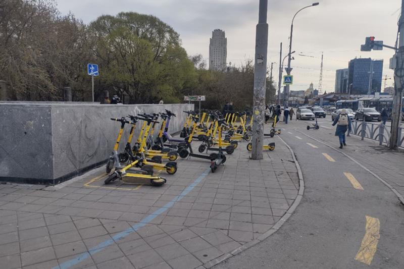 Утром он сфотографировал стихийную парковку электросамокатов у выхода из метро возле Дендропарка на улице Куйбышева. Соглашением прежде было предусмотрено, что ближе чем на 15 м к станциям метро оставлять устройства нельзя.