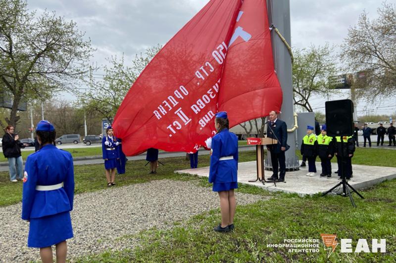 В Екатеринбурге прошла церемония поднятия копии Знамени Победы. Полотно площадью 40 кв. м теперь развевается в сквере Дружбы Народов на пересечении улицы Фронтовых Бригад и проспекта Космонавтов.