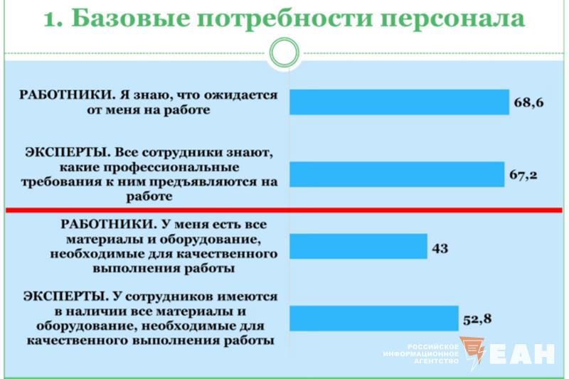 В докладе указывалось, что свыше 75% опрошенных удовлетворены своим трудом, его характером и содержанием. Большая часть опрошенных заявляют о том, что их организация заставляет их чувствовать, что их работа является крайне важной; они стремятся выполнять свою работу как можно более качественно, что у них имеются все возможности на рабочем месте, чтобы выполнять свою работу с наилучшим качеством, способствуя достижению цели медицинской организации.