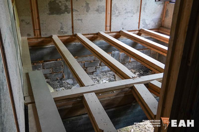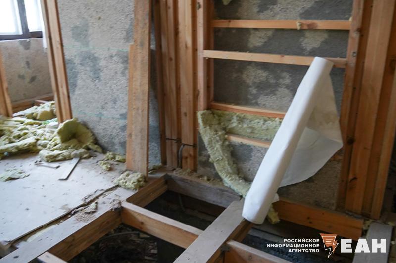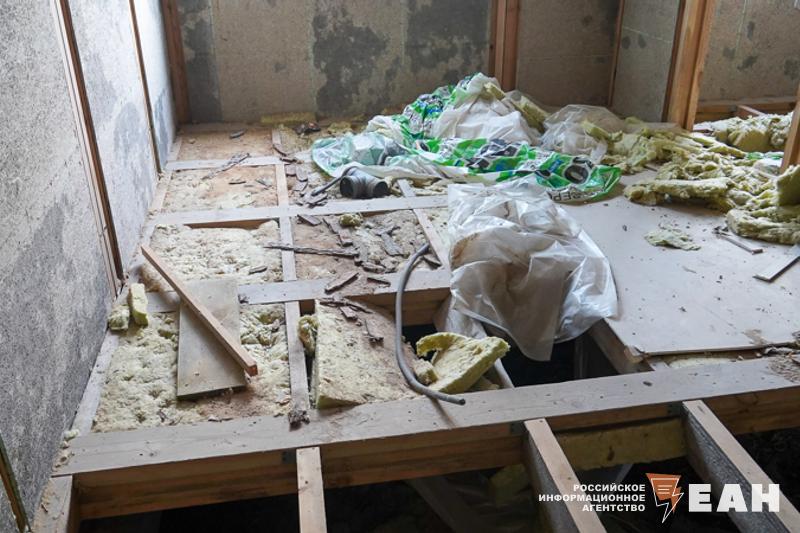 Издалека двухэтажный трехподъездный дом выглядит вполне прилично, как новый. Лишь подъехав поближе, видим, что многие стекла в доме разбиты, дверь в один подъезд зашита болтами, а в другие подъезды даже дверей нет. В этих подъездах внутри лишь лаги для пола, отсутствуют перекрытия, лестницы. В подъезде, который формально числился жилым, все двери покорежены – мародеры ломами взломали их и разграбили квартиры.