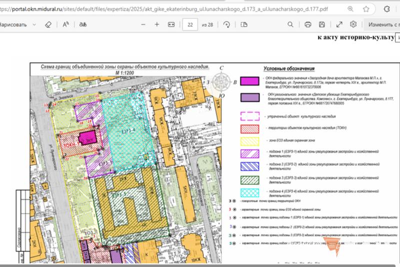 Речь идет о территории между домом Малахова (ул. Луначарского, 173а) — объектом федерального значения, и бывшим детским убежищем Екатеринбургского благотворительного общества (ул. Луначарского, 177) — памятником регионального значения. Эти два здания теперь включены в единую охранную зону. В результате исследований было установлено, что историческая среда в районе утрачена, однако сами памятники архитектуры сохраняют ценность, эксперты сочли обоснованным создание объединенной охранной зоны. Рядом с ней расположено несколько зон регулирования застройки, и прямо на сквер приходится зона застройки 4 (на скрине она выделена голубым), где, как следует из текста заключения, разрешается строительство новых высотных зданий, до 10 этажей, если они «не оказывают недопустимо негативного влияния» на восприятие памятников.