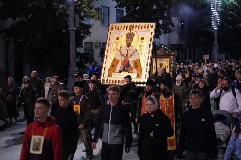 Большое внимание перед богослужением было уделено теме СВО. Военкор телеканала «Спас» Андрей Афанасьев продемонстрировал перед службой стяг, который российские военнослужащие водрузили в освобожденном Угледаре. По словам Афанасьева, военные впоследствии попросили его пронести это знамя на крестном ходе в память о святых царственных страстотерпцах. Немало было среди верующих и участников СВО, которые тянулись поговорить со всеми, кто пришел в форме.