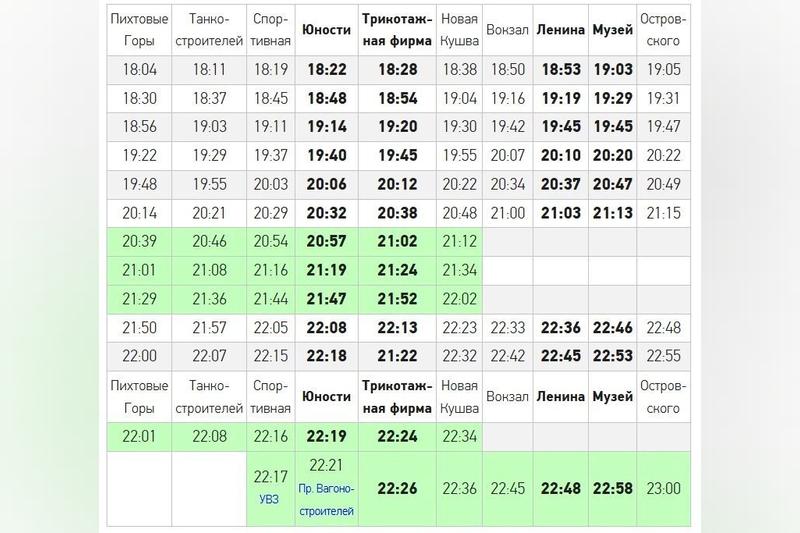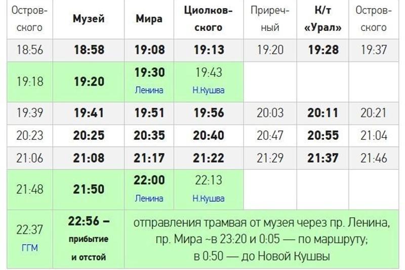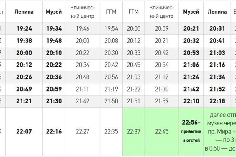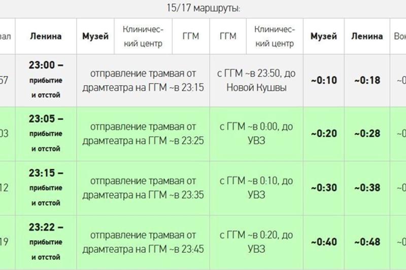 Первый автобус – в 23:15, следующие – каждые 15 минут, затем повторные рейсы с полуночи с тем же интервалом.