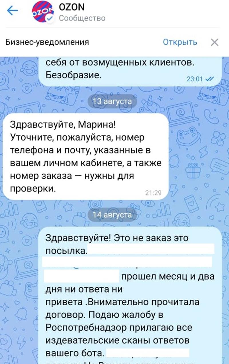 «Вопрос не только к качеству оказания услуги, а [к тому] как вообще такое возможно?! Это стопроцентное нарушение закона о правах потребителя», - рассуждает екатеринбурженка. Она намерена подать жалобу в Роспотребнадзор, а также досудебный иск к Ozon.