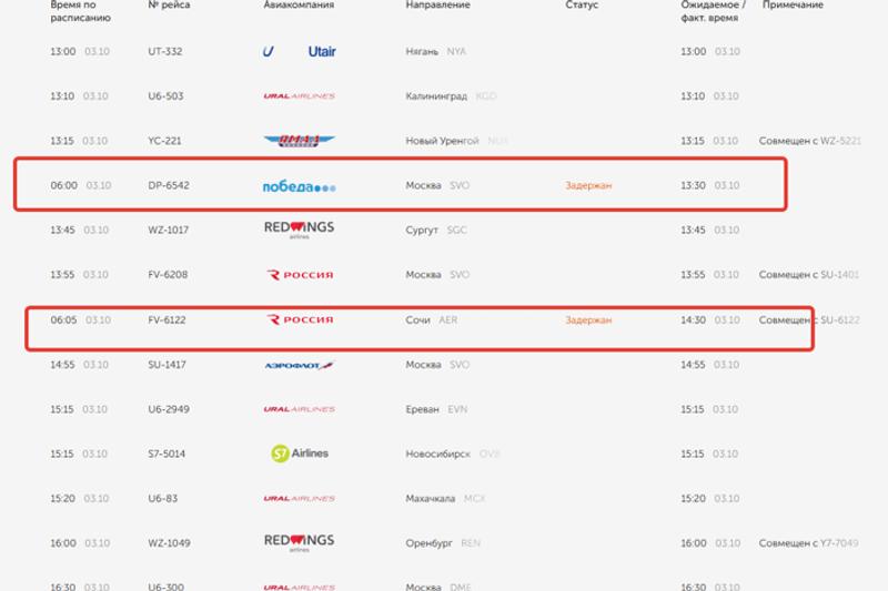 С задержкой будут выполнены рейсы «Аэрофлота», «Уральских авиалиний», «России» и «Победы». Некоторые вылеты отстают от расписания на час, а у нескольких лайнеров задержка составляет 7-8 часов. Также с опозданием в три часа ожидается отправка рейса Azur Air в Анталью.