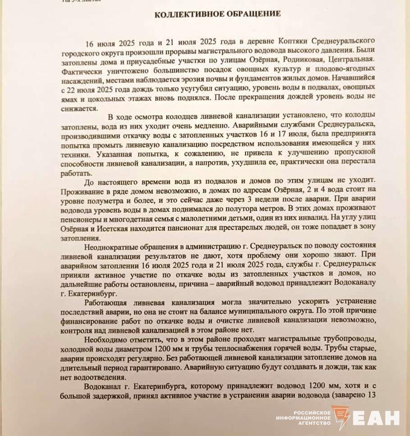 Местные жители уже обратились с официальным обращением к руководству области, чтобы администрация Среднеуральска занялась ливневкой. Ожидают люди и действий в отношении екатеринбургского водоканала. Жители Коптяков уверены, что если не решить вопрос с продолжающимся поступлением воды из магистрального водовода (очередная авария на нем произошла накануне), в зимний период это приведет к разрушению фундаментов домов. Дальнейшее проживание жителей в своих домах станет небезопасным, и последствием станет серьезная социальная напряженность.