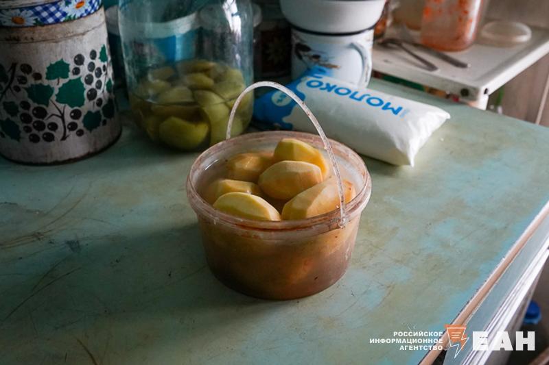 В отдельной комнате у пенсионеров мешки с картошкой и три больших мешка сухарей. На кухне, опять же, почищенная картошка. «На вечер вот опять пожарю», - говорит хозяйка. В холодильнике пустота, лишь остатки кетчупа с майонезом, яйца, вилок капусты и молоко.