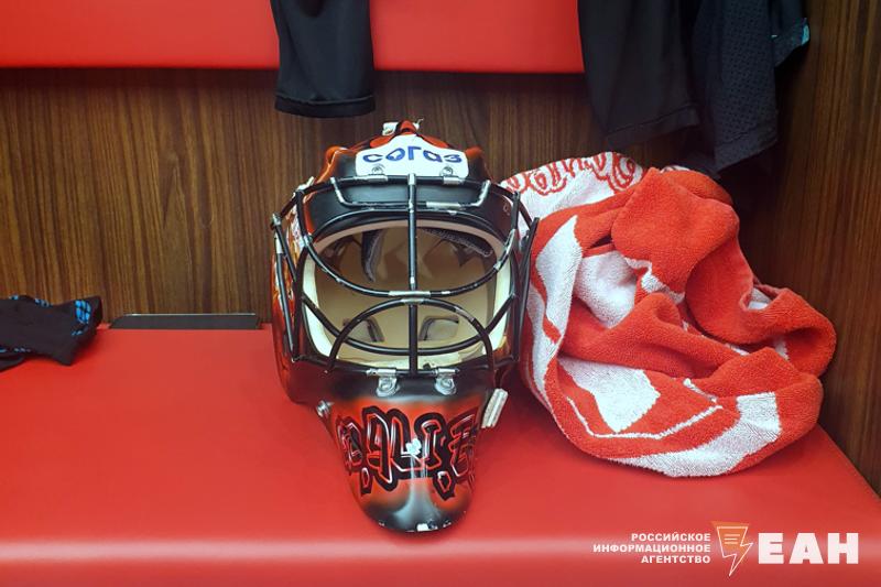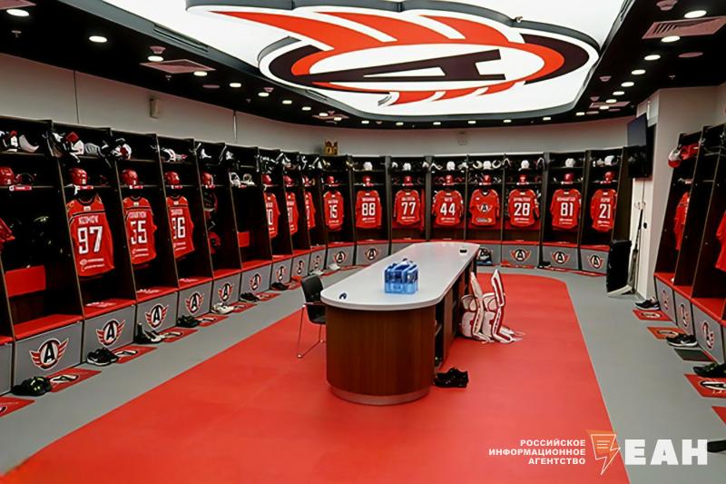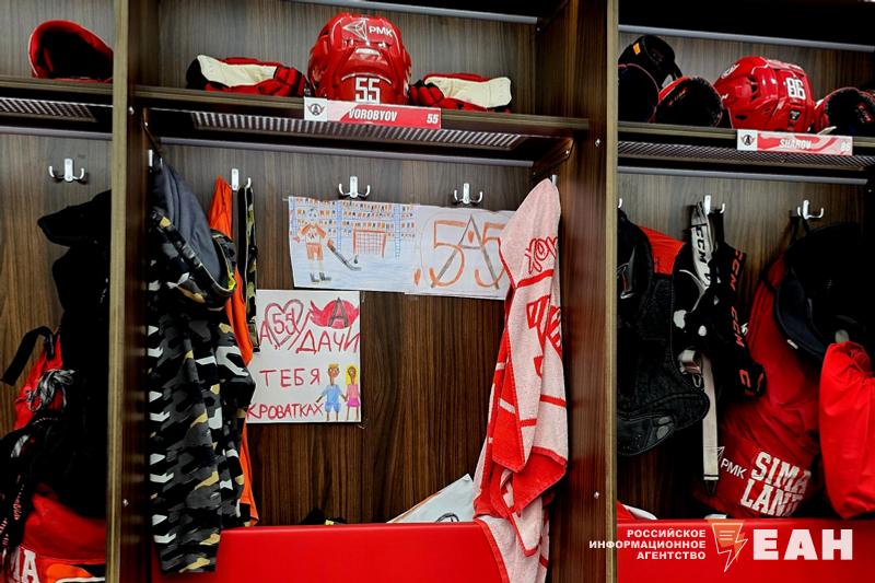 Пройдя по коридору, игроки попадают в просторную раздевалку. В удобных шкафчиках спортсмены разместили свои вещи, а Кирилл Воробьев даже украсил его рисунками своих детей. Места для вратарей выделяются — они шире обычных, чтобы вместить объемную амуницию. В помещении есть телевизор, тактическая доска, в середине большой стол с необходимыми напитками и продуктами. Над столом висит большая панель с логотипом команды.