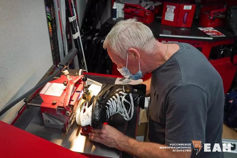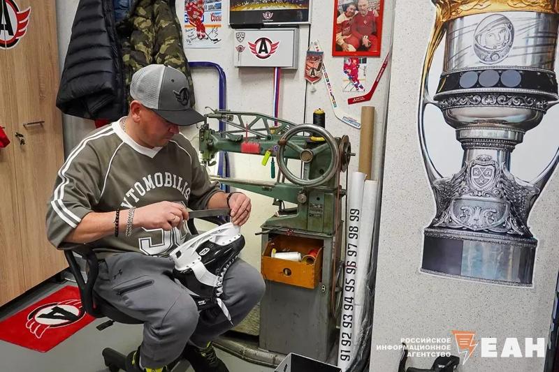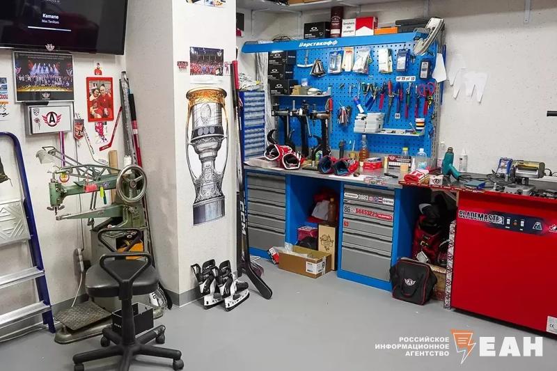 Напротив раздевалки расположена мастерская сервисменов — идеальное место для оперативной помощи. У каждого специалиста здесь свой уголок для работы. Николай Поспелов отвечает за заточку коньков. Он доводит лезвия до идеальной остроты, подстраивая их под стиль катания каждого игрока. Анастас Шумов занимается формой и амуницией: чинит экипировку, работает на швейной машинке и следит за каждой деталью. Вместе сервисмены слаженно следят, чтобы игроки могли сосредоточиться только на игре. Перед матчем они развешивают джерси так, «чтобы видеокамеры снимали красиво», аккуратно раскладывают экипировку. Если игрок получил новые коньки — формуют ботинок, чтобы он идеально повторял анатомию стопы.