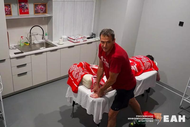 Ильшат Гайнуллин, Александр Белов и Павел Воложенинов начинают рабочий день раньше всех: готовят воду, зал и полотенца. Затем — поток растираний, разогрева и ручной работы с мышцами игроков. Просторный массажный кабинет позволяет обеспечить комфорт для каждой процедуры.