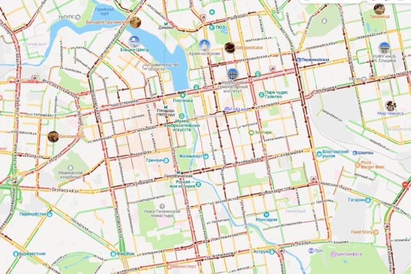 Судя по карте, на дороге более 10 аварий. ДТП произошли на Машинной, перекрестке Декабристов - Восточная, Верх-Исетском бульваре, Малышева и других улицах.