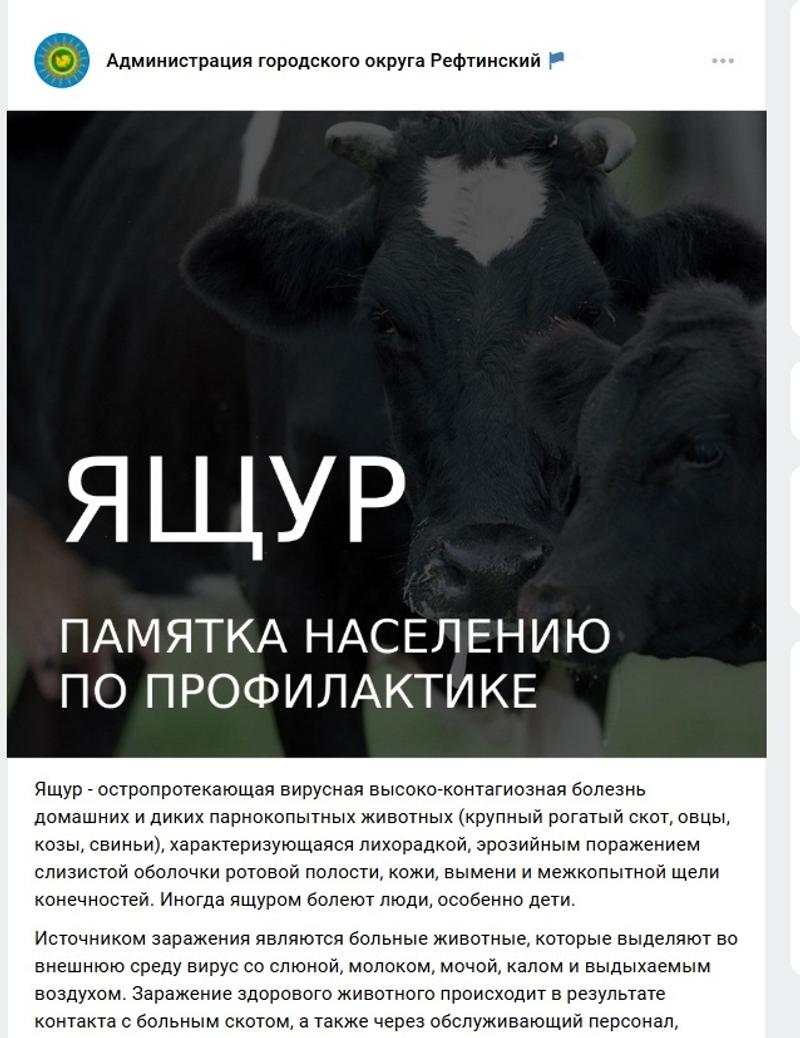 По словам инсайдеров, причиной возможной вспышки ящура среди коров и коз стали косули. У участников отрасли возникли также опасения, что молоко от инфицированных животных могло попасть на предприятия переработки. В частности, под подозрением оказались Ирбитский молокозавод и Талицкий молокозавод. Официальных подтверждений этой информации не поступало. Но одновременно с распространением слухов об массовом заболевании животных в муниципалитетах выпустили предупреждение о ящуре. Так, памятку о профилактике этого заболевания опубликовала администрация городского округа Рефтинский и противоэпизоотический отряд Тюменской области.