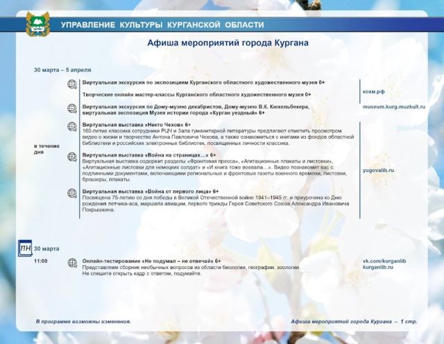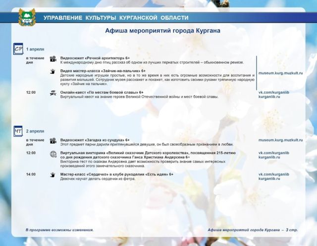 Среди мероприятий – виртуальная экскурсия по экспозиции Курганского областного художественного музея, семейный конкурс видеороликов ко Дню Победы, мастер-классы для детей по изготовлению игрушек и многое другое.
