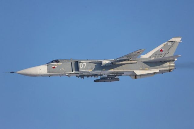 В Курганской области прошли военные учения: истребители-бомбардировщики Су-34 и самолет-разведчик Су-24МР уничтожили условный командный пункт противника.