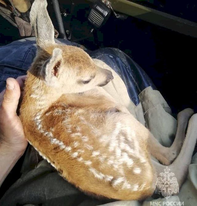 Мать-косуля вместе с другим своим детенышем смогла перепрыгнуть огненный фронт, а малыш оказался слишком мал и слаб для такого прыжка. Огонь уже опалил косуленку задние лапы, и, если бы не вовремя подоспевшие спасатели, он бы погиб.
