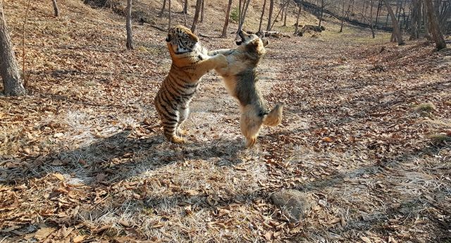 Напомним, Амур и Тимур прославились на всю Россию в 2015 году. Тигру привезли козла на съедение, но неожиданно животные подружились и некоторое время жили в одном вольере. В прошлом году оба приятеля обзавелись потомством: у Амура родился сын Шерхан, а у Тимура – Тимурид.