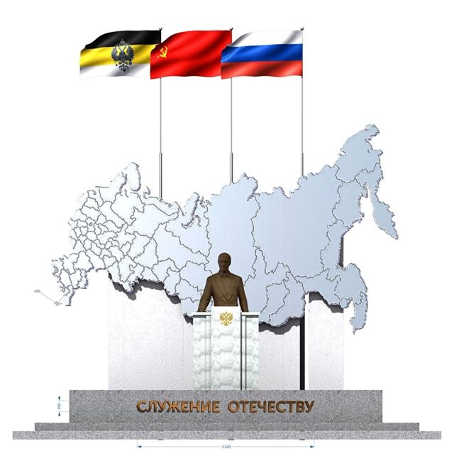 Ансамбль состоит из трех элементов. В центре композиции — бронзовая скульптура Путина высотой 3,5 м. Автор монумента Ольга Красношеина работала над его созданием полгода. За фигурой Владимира Путина располагается карта России, высота и ширина которой 6 м. Над ней будут размещены флаги Российской империи, СССР и современной России.