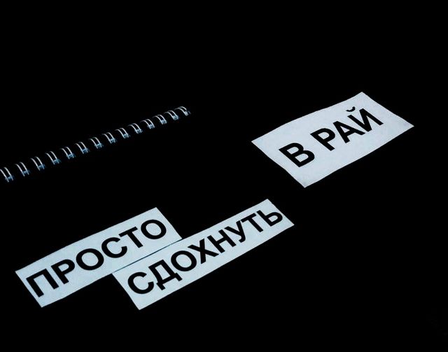 На груди у Смерти была табличка с цитатой президента РФ Владимира Путина «Мы, как мученики, попадем в рай, а они просто сдохнут». Смерть предлагала два черных блокнота, на одном из которых было написано «Рай», а на другом – «Просто сдохнуть», нужно было выбрать один из них и записать туда свое имя.