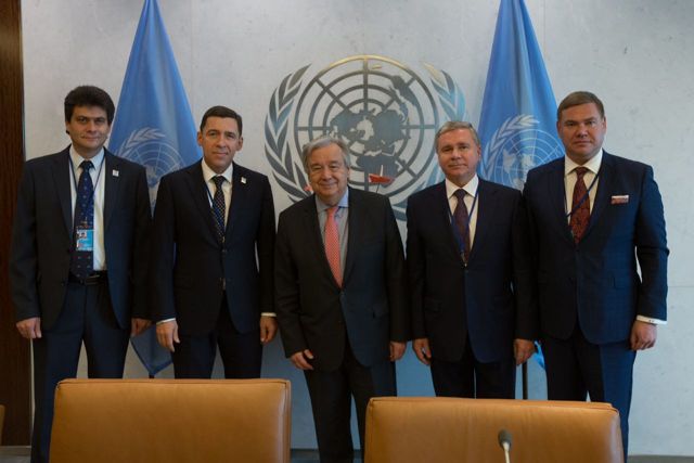 Свердловский губернатор Евгений Куйвашев и мэр Екатеринбурга Александр Высокинский в настоящий момент встречаются в Нью-Йорке с генеральным секретарем ООН Антонио Гутерришем. Также во встрече принимает участие министр правительства Москвы, директор департамента внешнеэкономических и международных связей Сергей Черемин. Детали встречи будут известны позже.