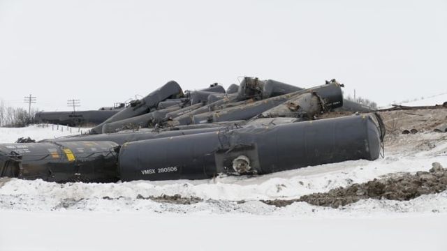 ЧП случилось в 03:30 на одной из наиболее загруженных железнодорожных линий Канады. 37 цистерн товарного состава сошли с рельсов, в результате чего произошел частичный разлив неочищенной нефти.