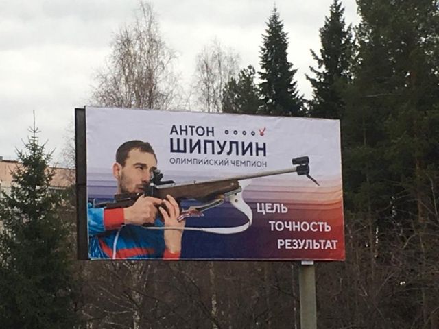 Жители Серова заметили на улицах города первые рекламные баннеры олимпийского чемпиона по биатлону. На билбордах размещено фото спортсмена, стреляющего из винтовки, со слоганом «Антон Шипулин. Олимпийский чемпион. Цель. Точность. Результат».